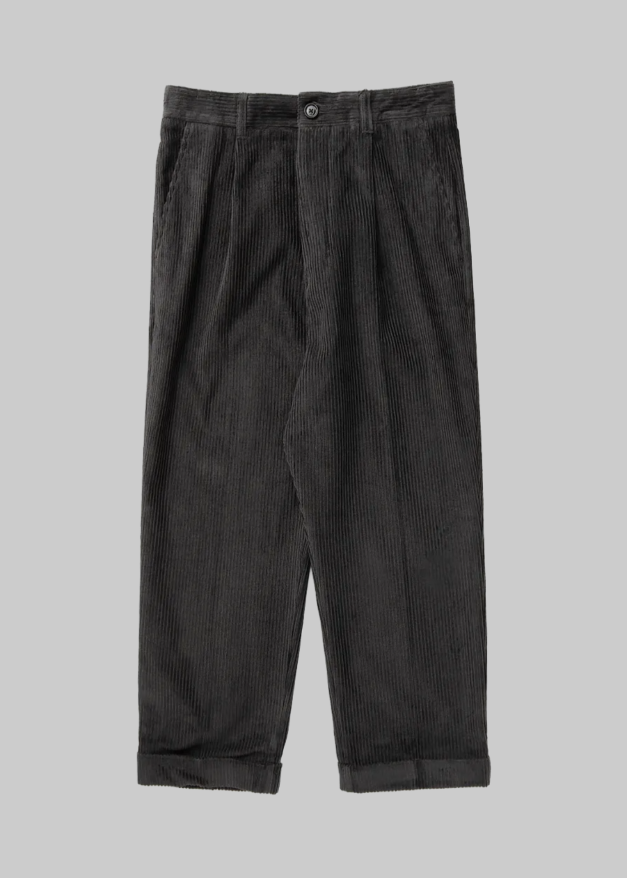Pantaloni oversize a carota in cotone a costine con pieghe frontali, chiusura con bottoni  e polsini sul fondo.