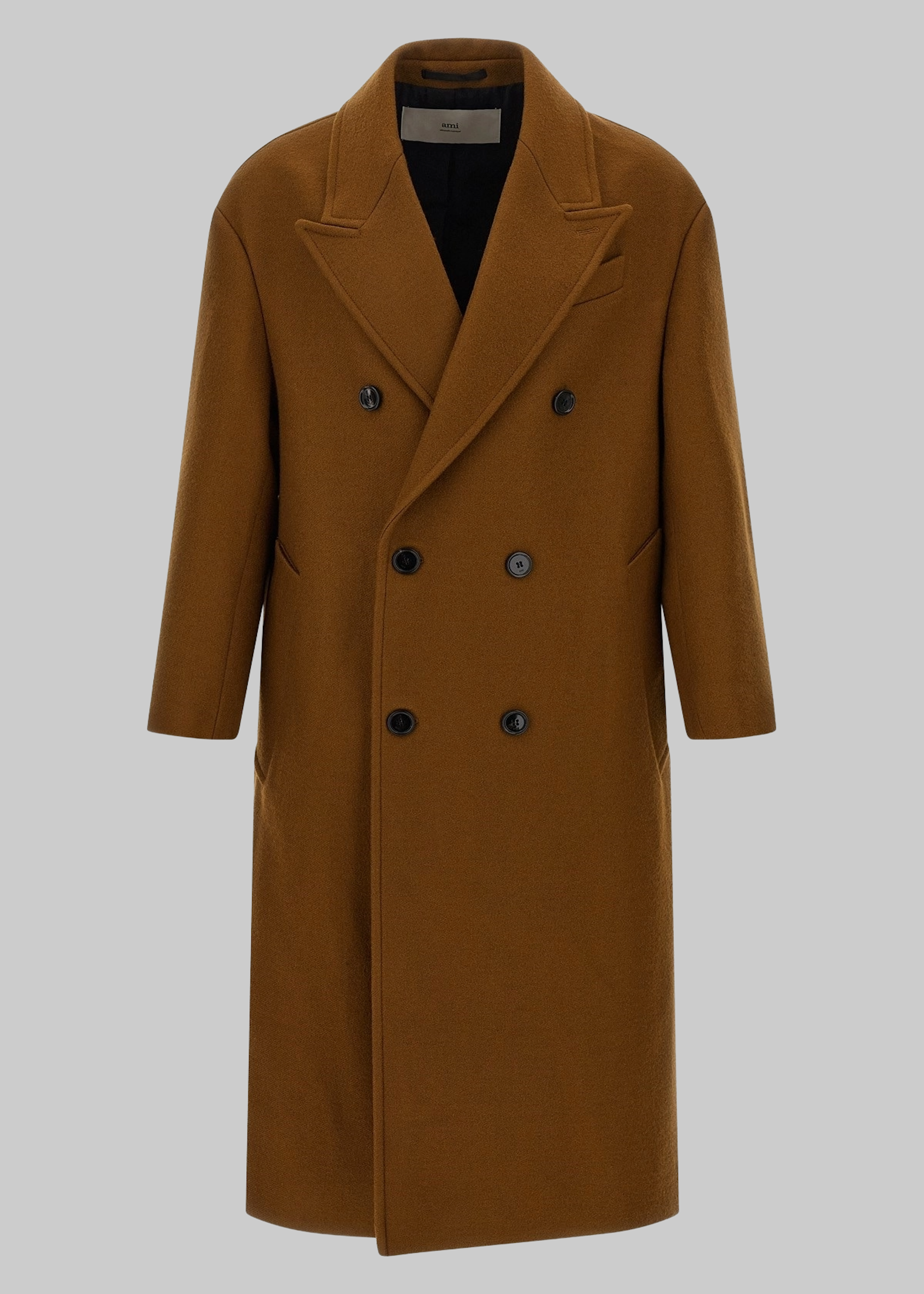 Cappotto lungo doppiopetto in lana con rever a lancia, chiusura a sei bottoni, tasche laterali inclinate, bottoni sui polsini e spacco posteriore, vestibilità ampia.