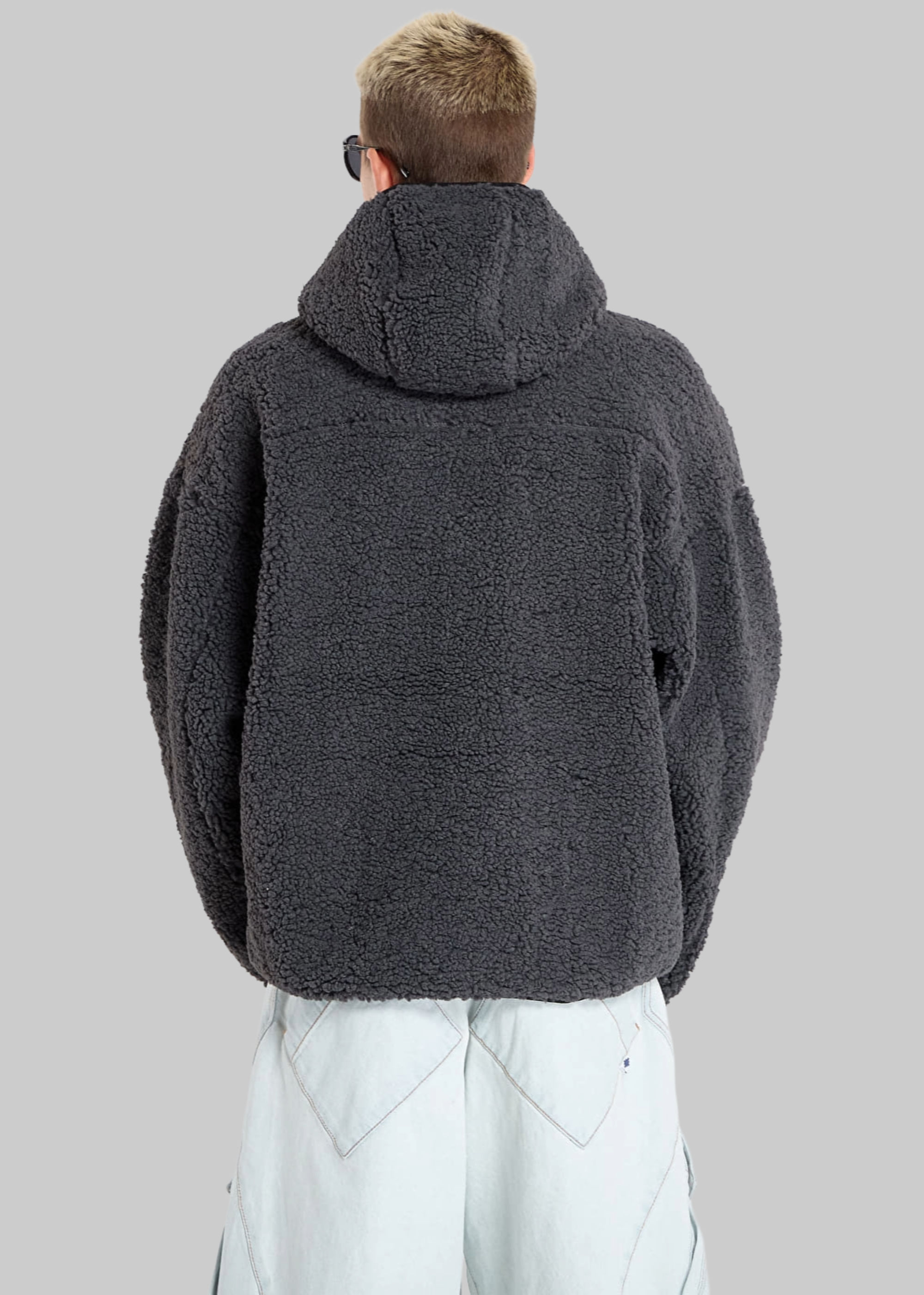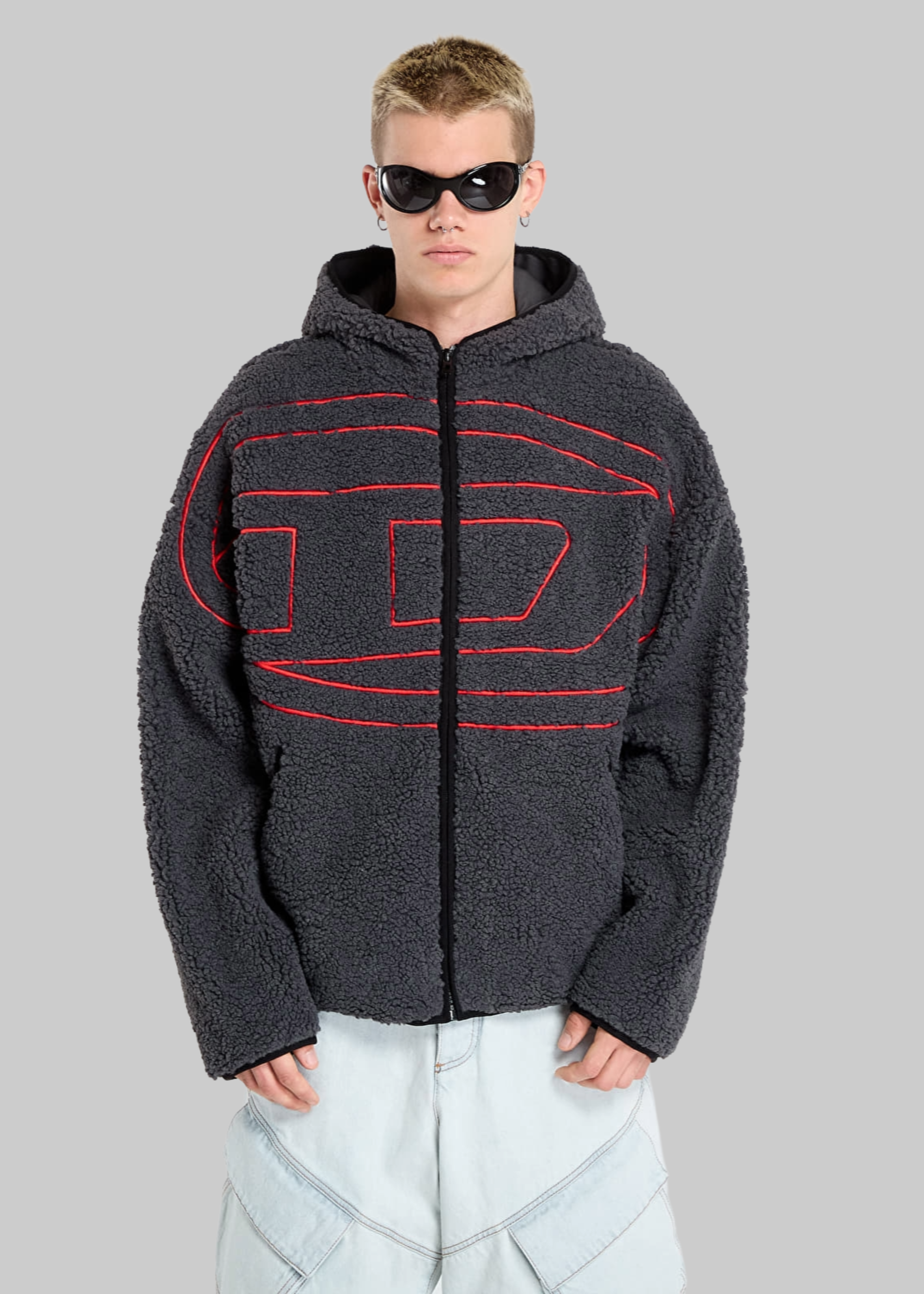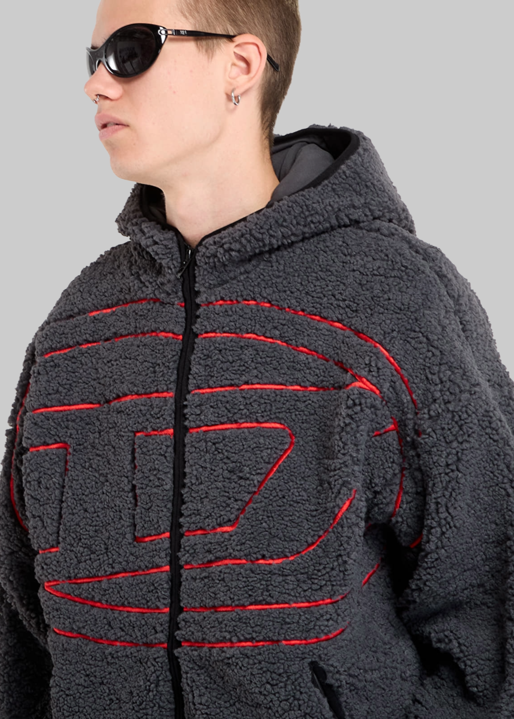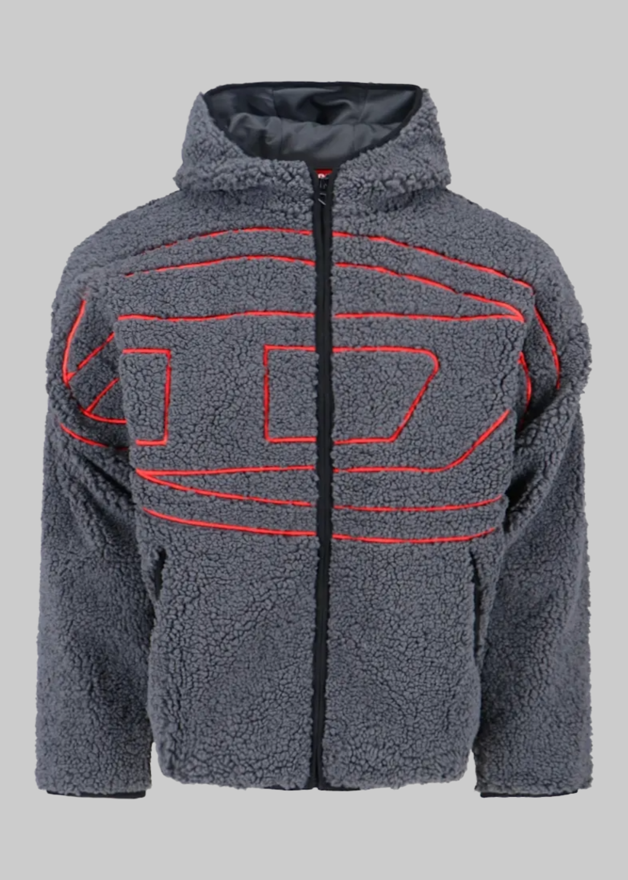 Felpa in pile con cappuccio, chiusura lampo e stampa centrale.