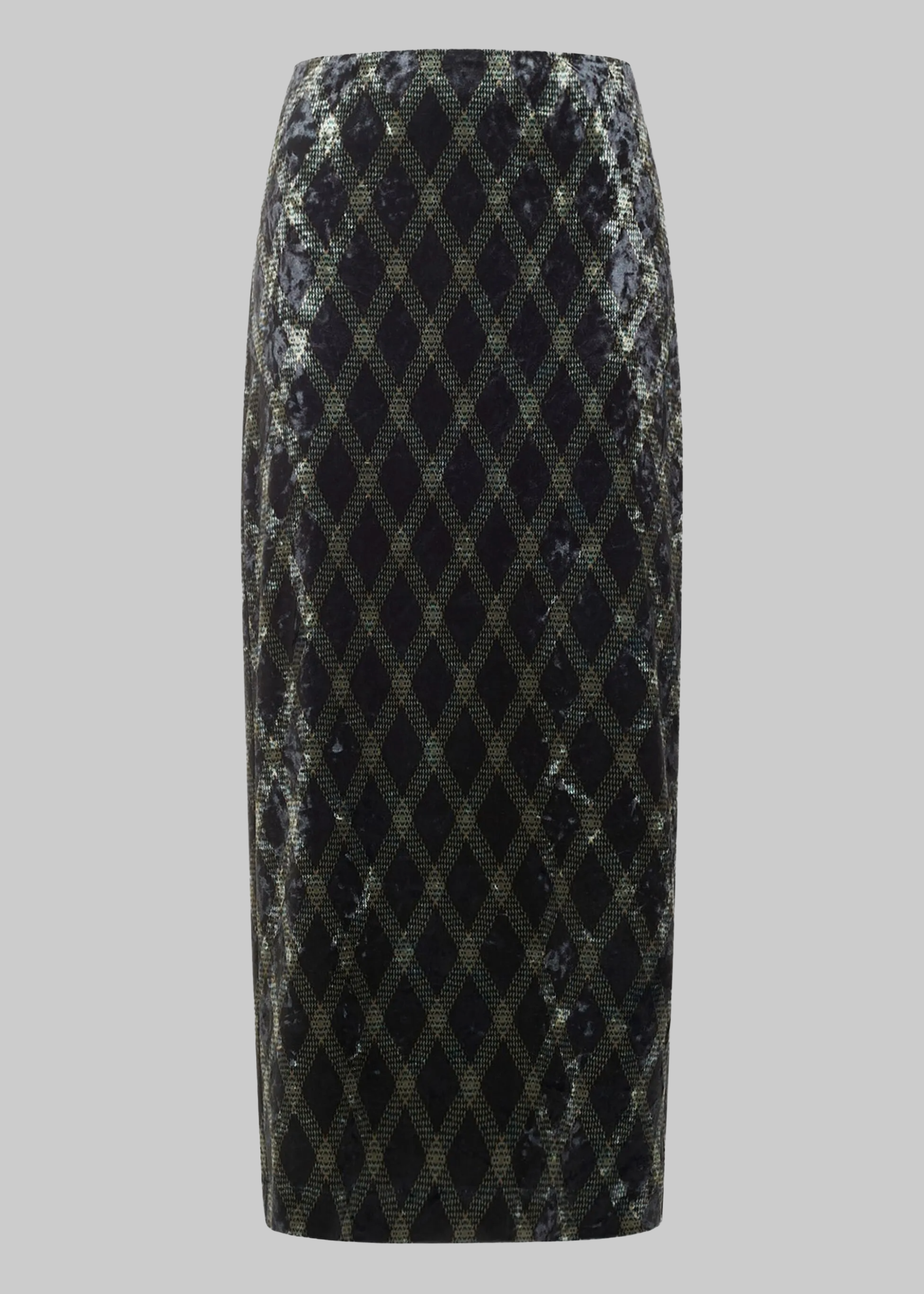 Gonna velluto con fantasia geometrica e chiusura lampo invisibile sul retro.