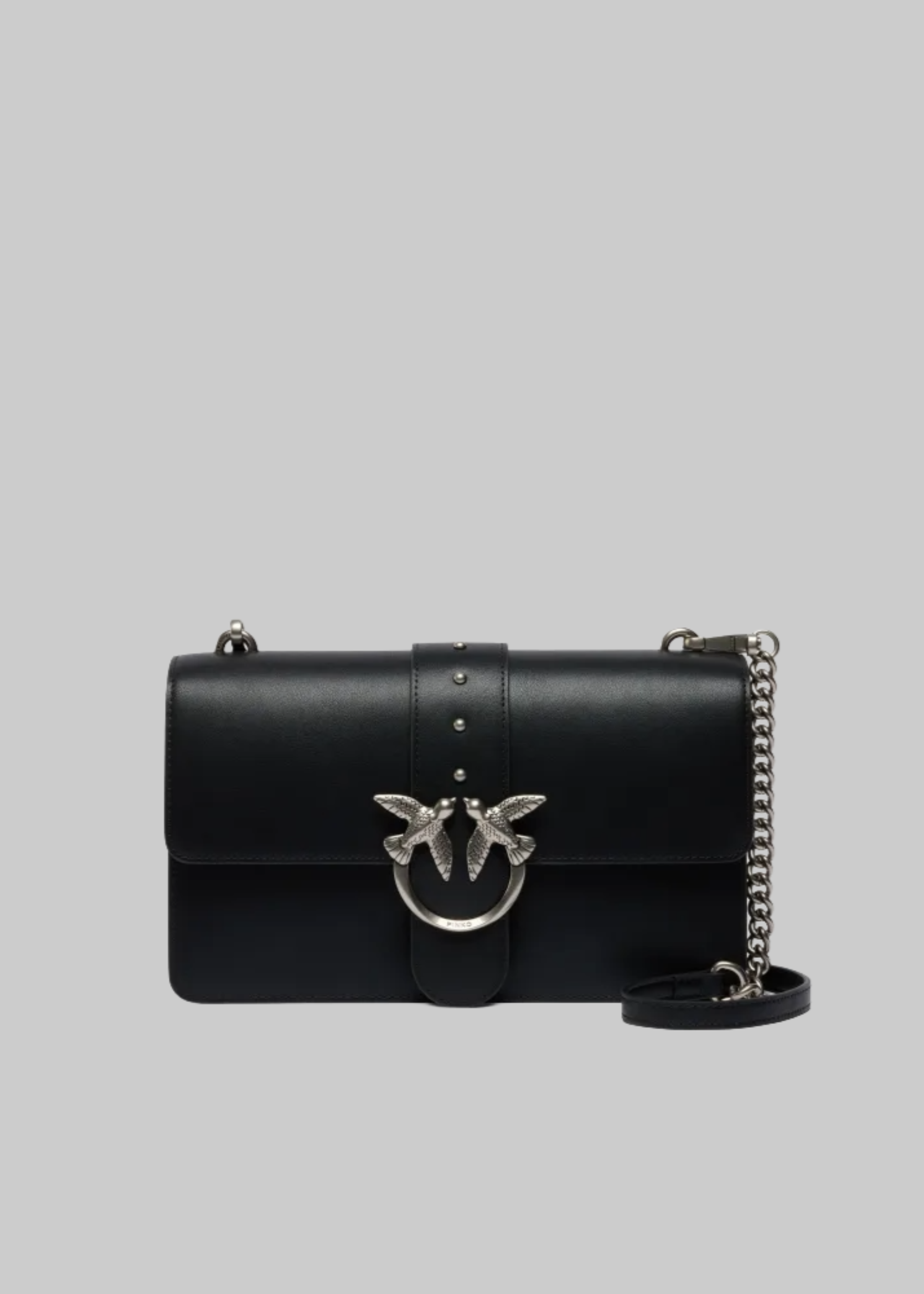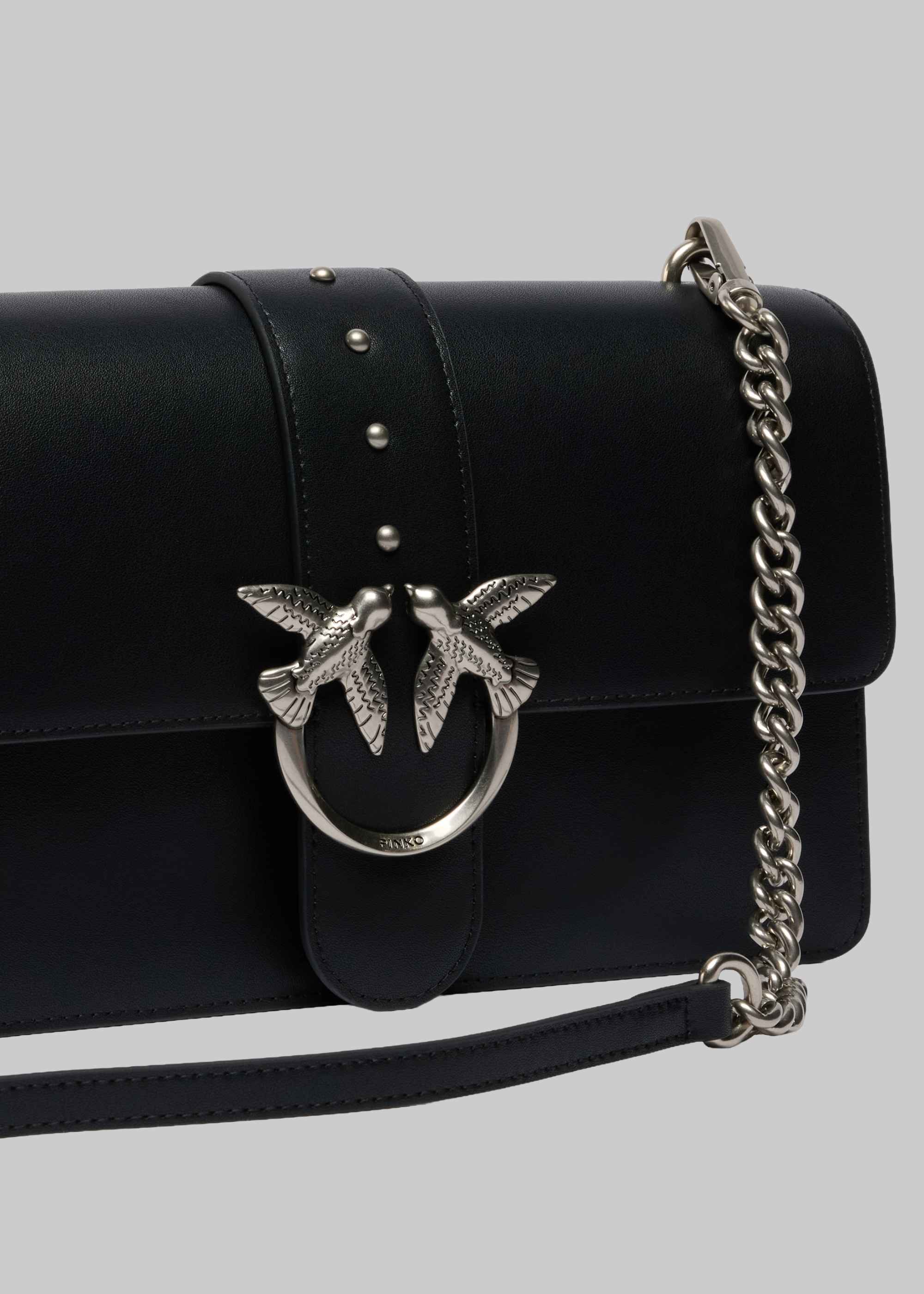 Borsa media da donna realizzata in poliuretano effetto vitello. Chiusura con patta frontale e fibbia iconica Love Birds in metallo dorato. Tracolla regolabile in catena dorata e materiale sintetico, utilizzabile a spalla o a tracolla. Interno organizzato con scomparti multifunzione.