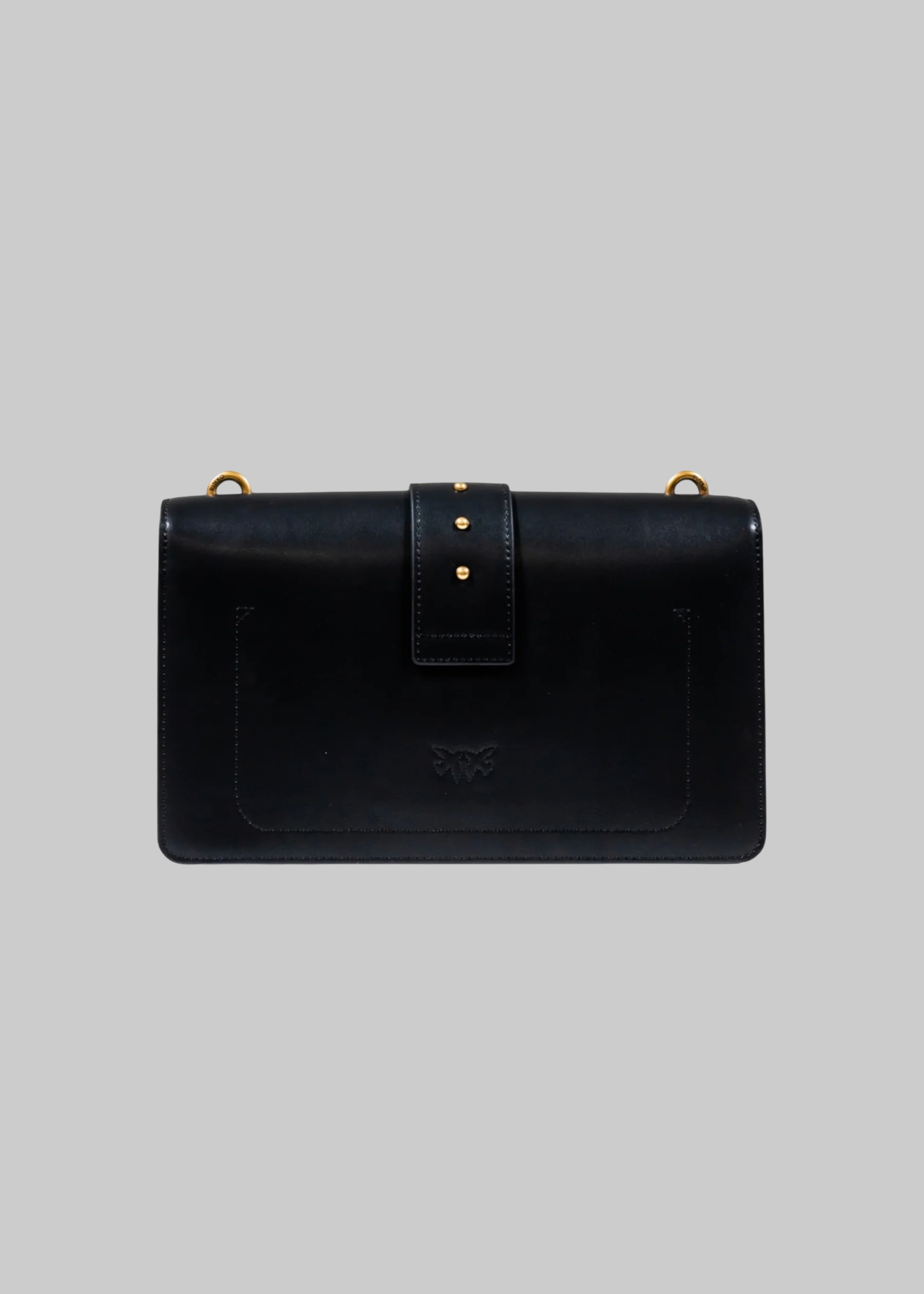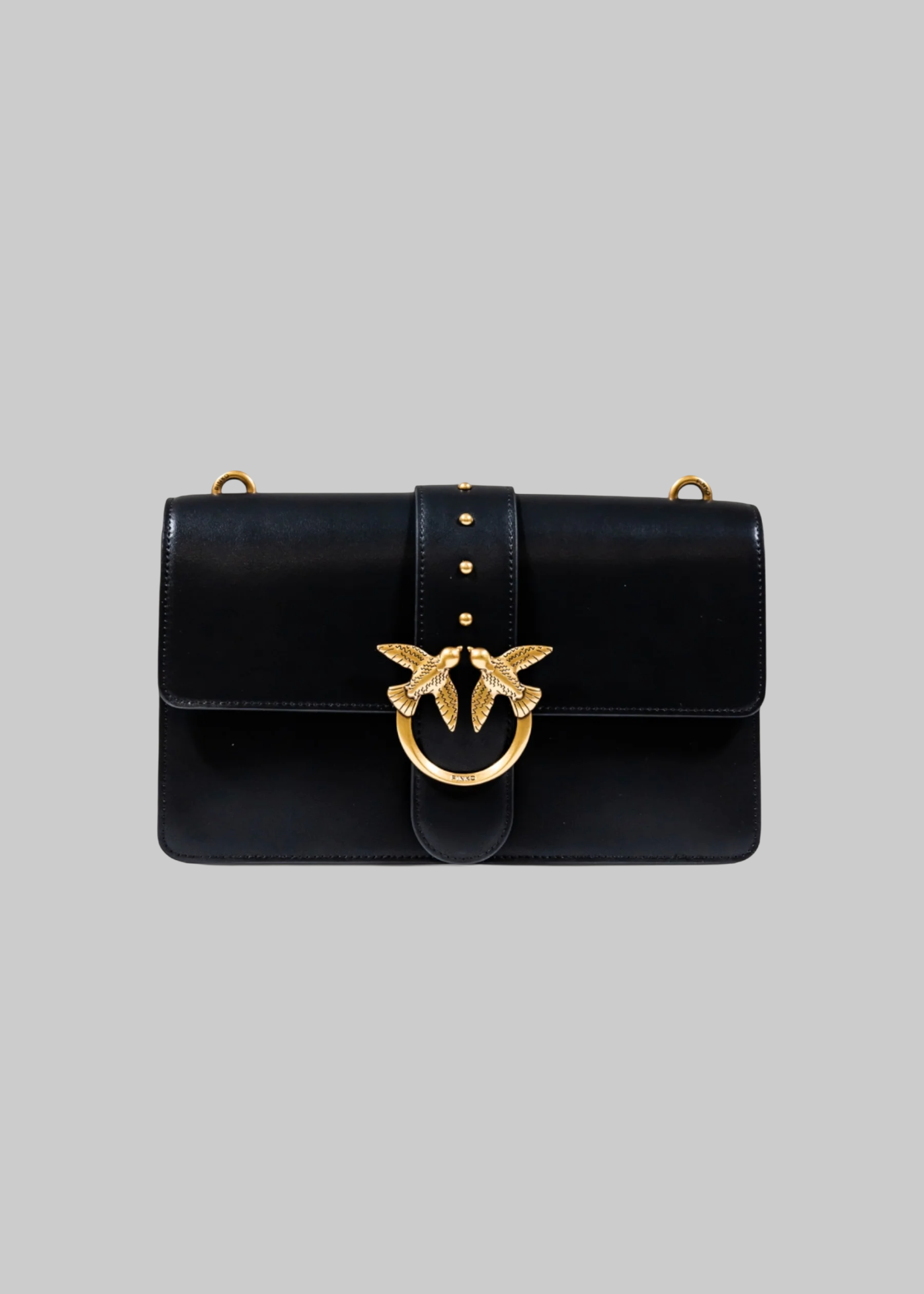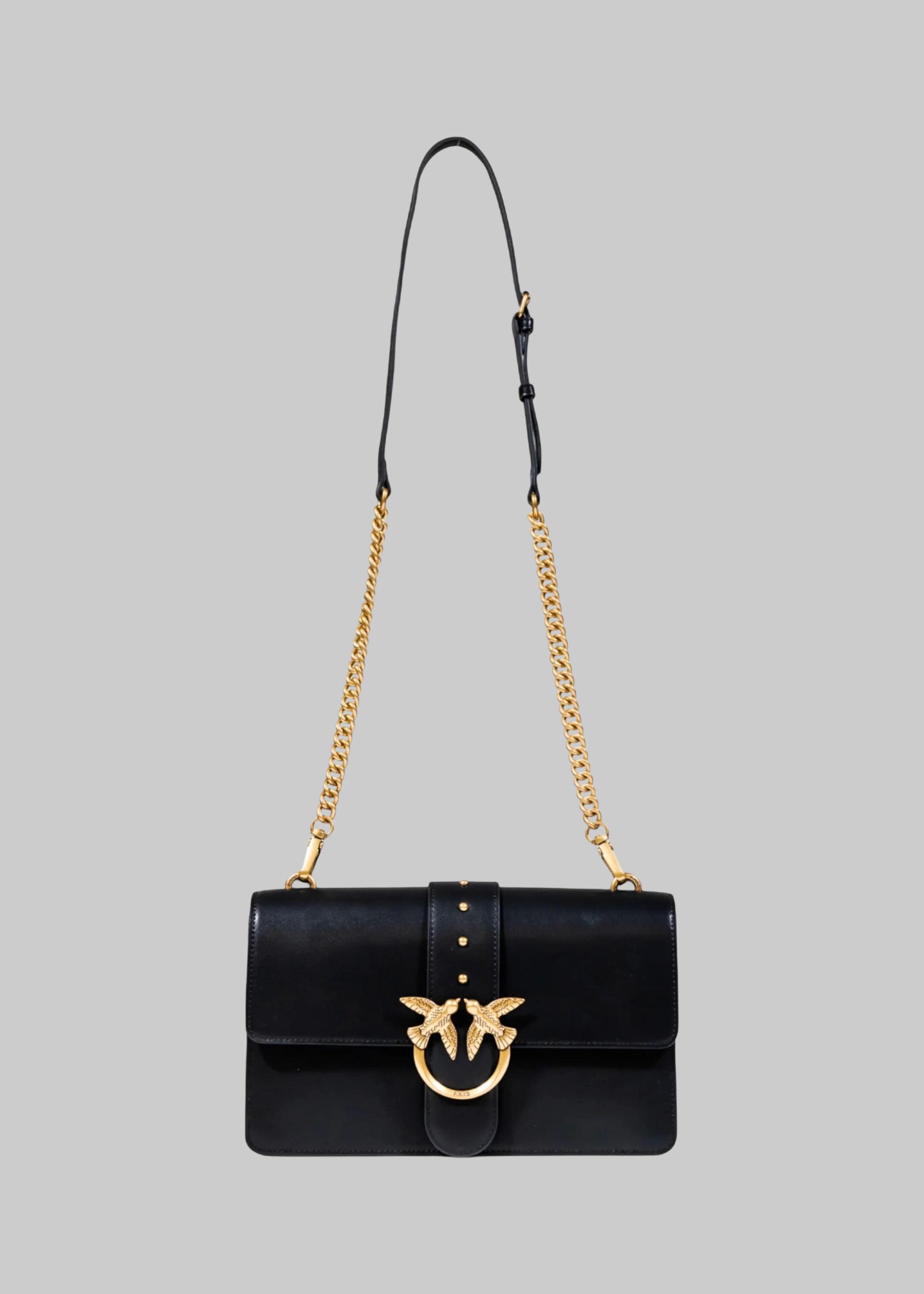 Borsa media da donna realizzata in poliuretano effetto vitello. Chiusura con patta frontale e fibbia iconica Love Birds in metallo dorato. Tracolla regolabile in catena dorata e materiale sintetico, utilizzabile a spalla o a tracolla. Interno organizzato con scomparti multifunzione. Design elegante, adatto a look casual ed eleganti.