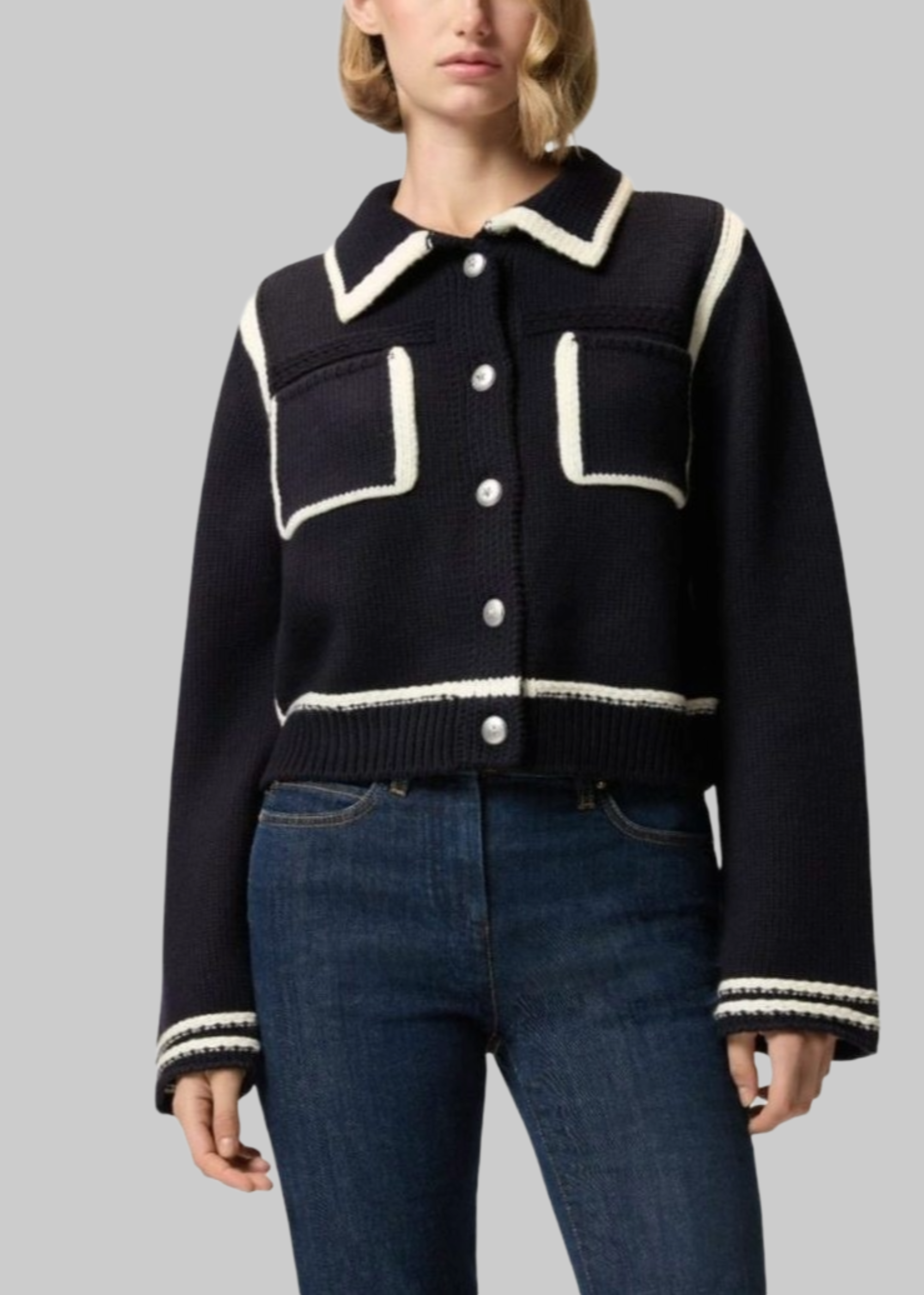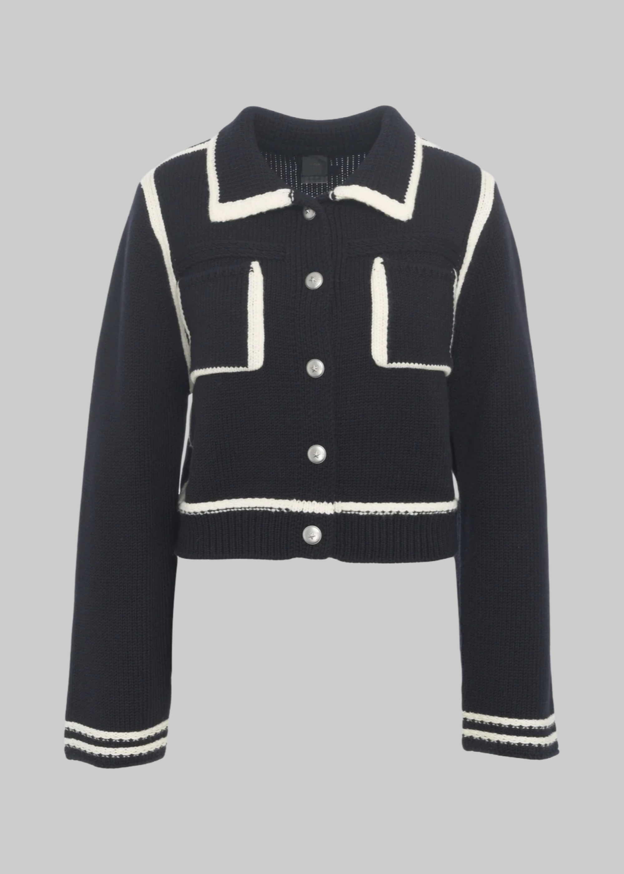 La maglia di alta qualità è morbida al tatto, mentre il profilo a contrasto su colletto, maniche, tasche e orlo definisce il design. La chiusura frontale presenta bottoni con dettagli a stella per un tocco distintivo. Due tasche applicate sul petto aggiungono funzionalità e stile.